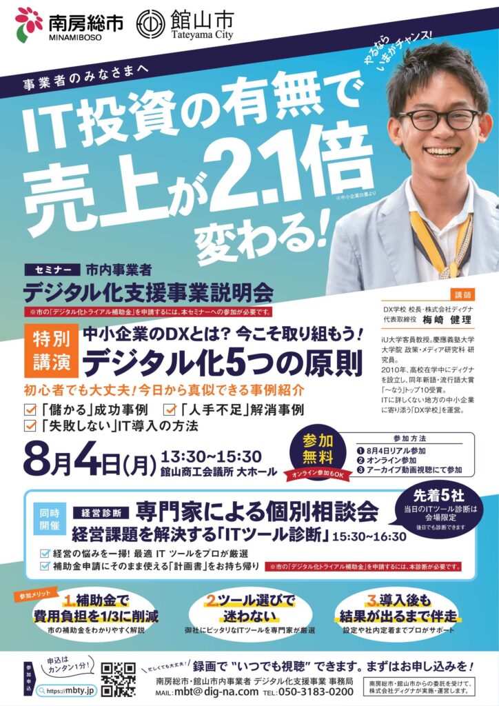 全国約100拠点に「DX学校」を展開する株式会社ディグナ(東京都港区、代表取締役 梅崎健理)は千葉県南房総市・館山市の「令和7年度南房総市及び館山市内事業者デジタル化支援事業業務」プロポーザルに参加し、同社が提供する「DX学校」人材育成事業及びIT導入支援事業が採択され、実施・運営の委託を受けました。